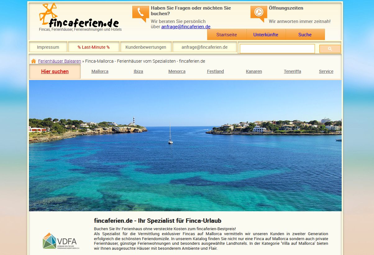 Gegründet wurde fincaferien 1997 aus der Liebe zum Reisen. Schon damals zählten wir zu den ersten Online-Vermittlungen für Fincas und Ferienhäuser und erkannten früh den Wert klarer Struktur sowie digitaler Zugänglichkeit, um Gäste individuell zu ihrem Traumurlaub zu begleiten. Heute führen wir das Unternehmen in zweiter Generation – mit langjähriger Erfahrung im Kundensupport und der IT – und verbinden Tradition mit moderner Expertise.